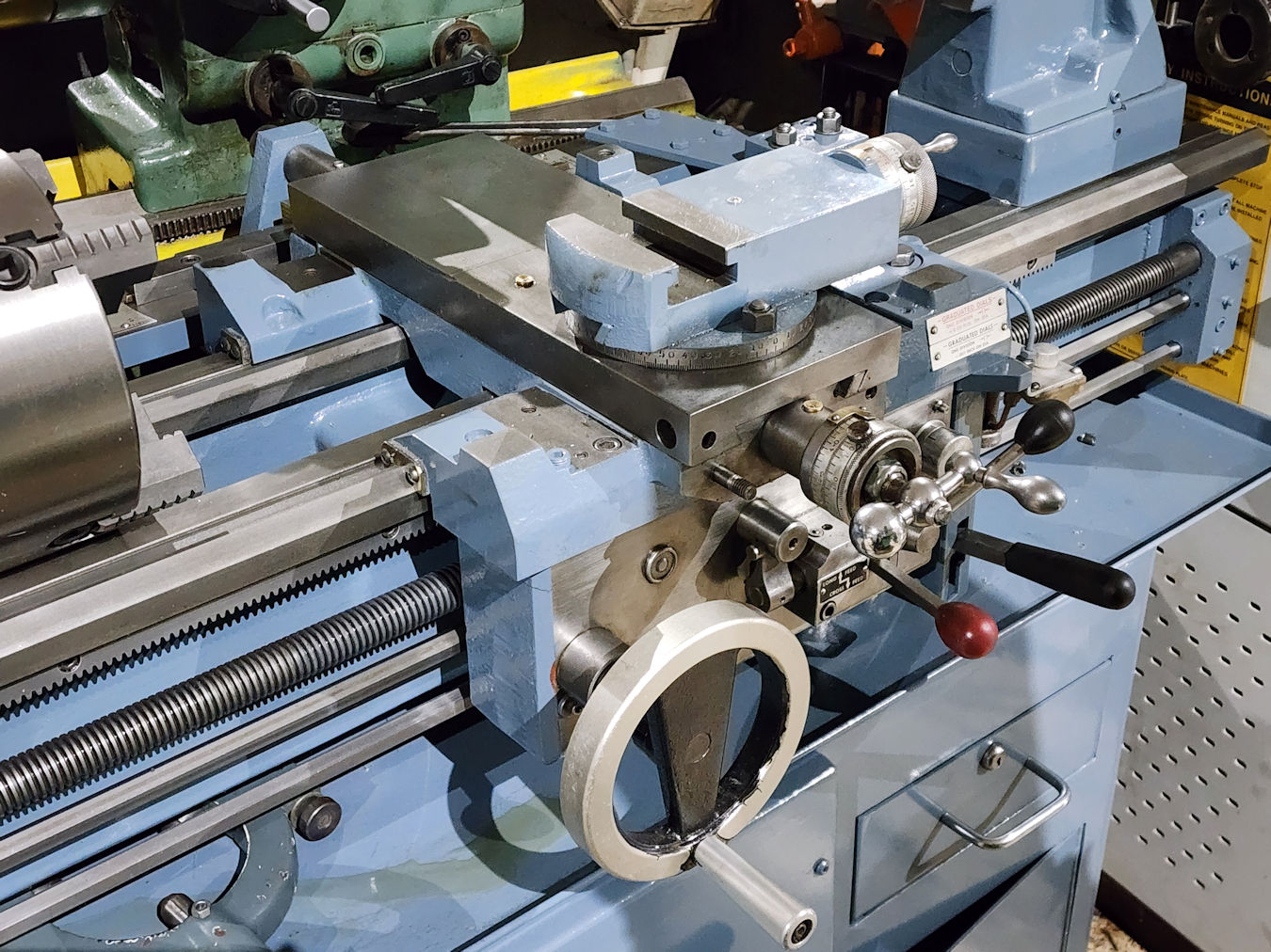 Inch/mm dials on carriage & cross slide, Pull out drawers &