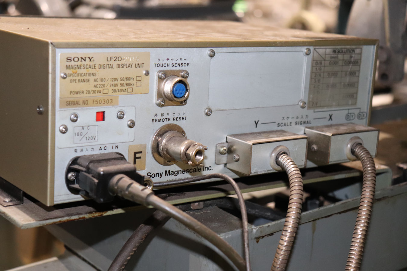 stops on table, Adjustable work light, Sony LF-200 Y/Z DRO with inch/mm, Parts manual, Overall Dim. 4' 11"W x 4'