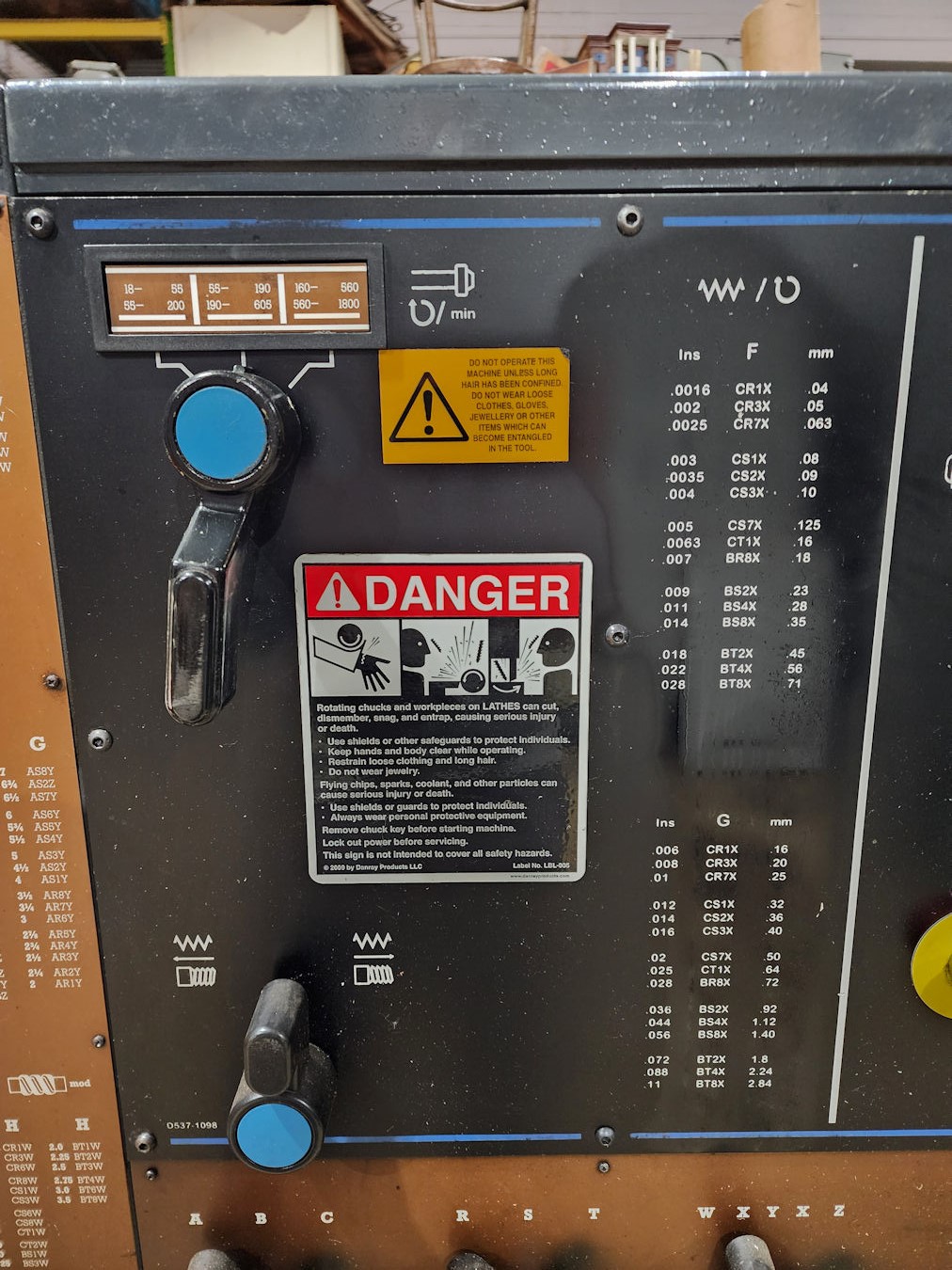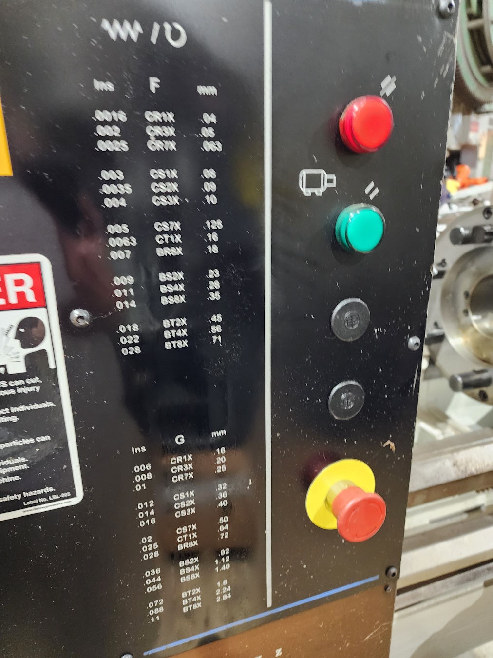 Threading ranges from 4 to 224, Thread dial on carriage, Full