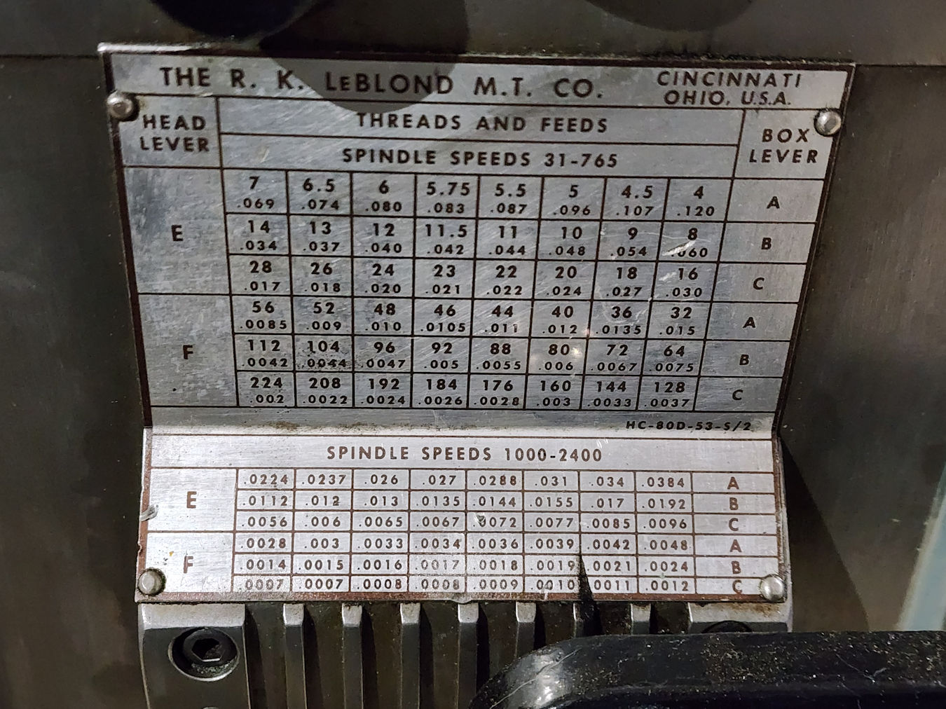 Catalogue size 20"CM, S# 28253, Date Mfg. 10/1953, 22.5" Swing, 48" Between centers, 16 Spindle