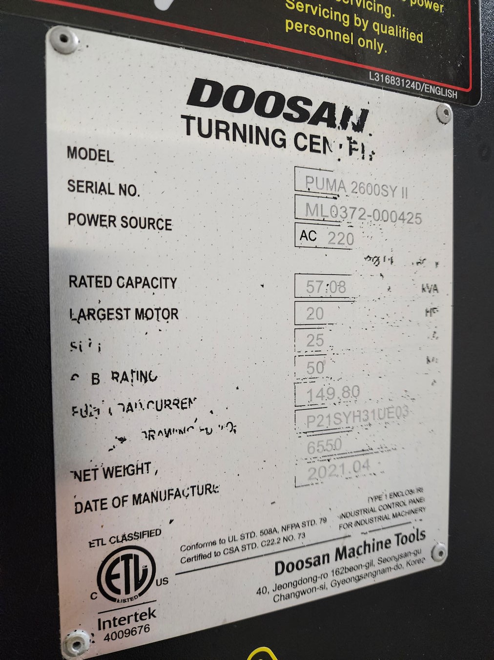 Model PUMA 2600SY II, S# S# ML0372-000425, Date Mfg. 04/2021,