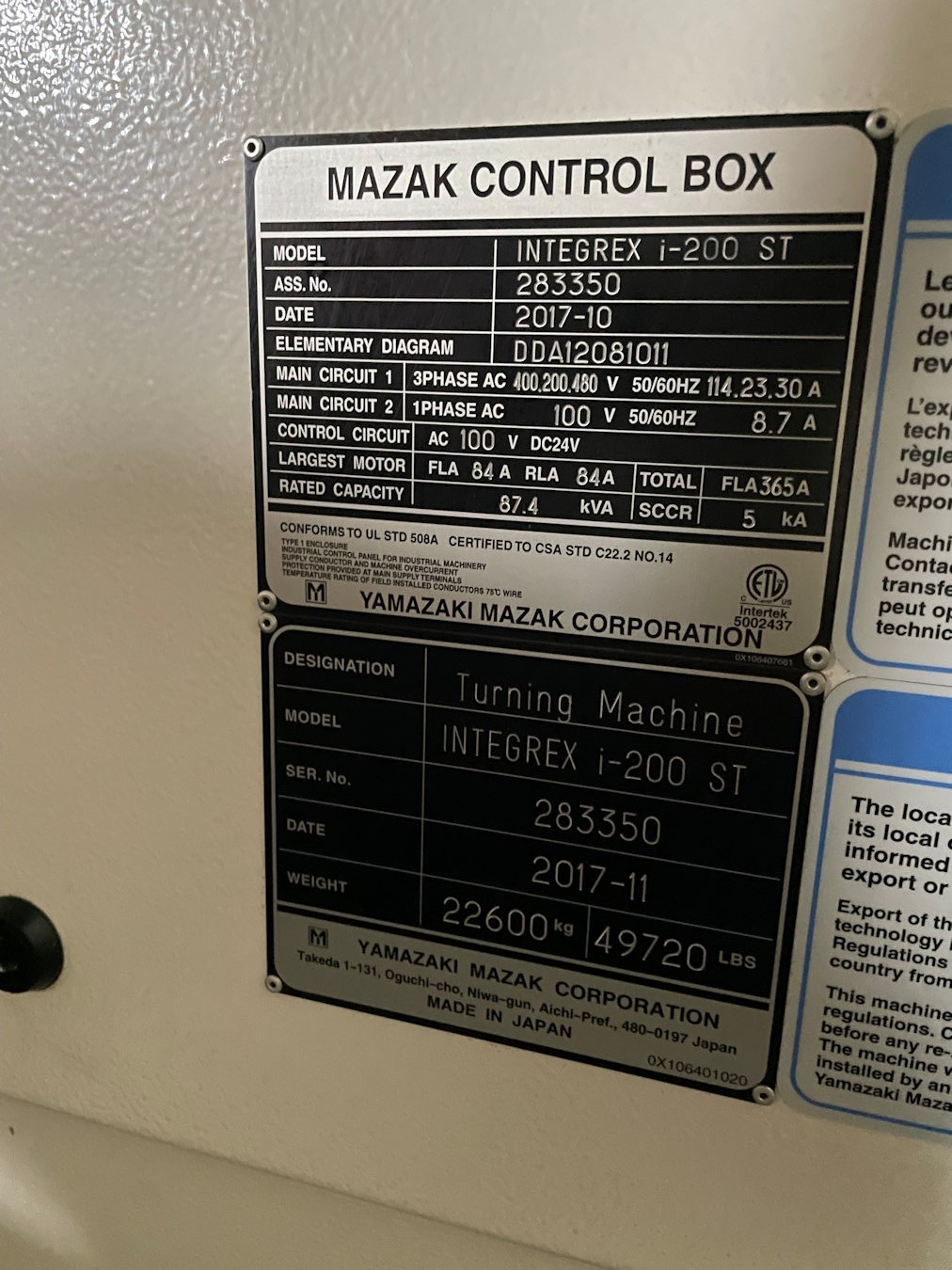 Model Integrex i-200 ST, S# 283350, Date Mfg. 11/2017, Mazatrol