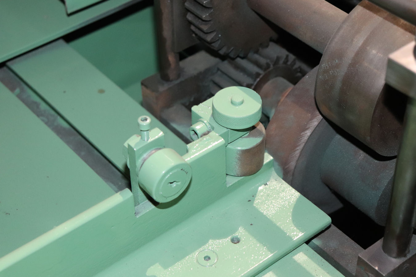 Support roller w/ back stop & guide rollers, Adjustable collet to lower/raise support rollers,