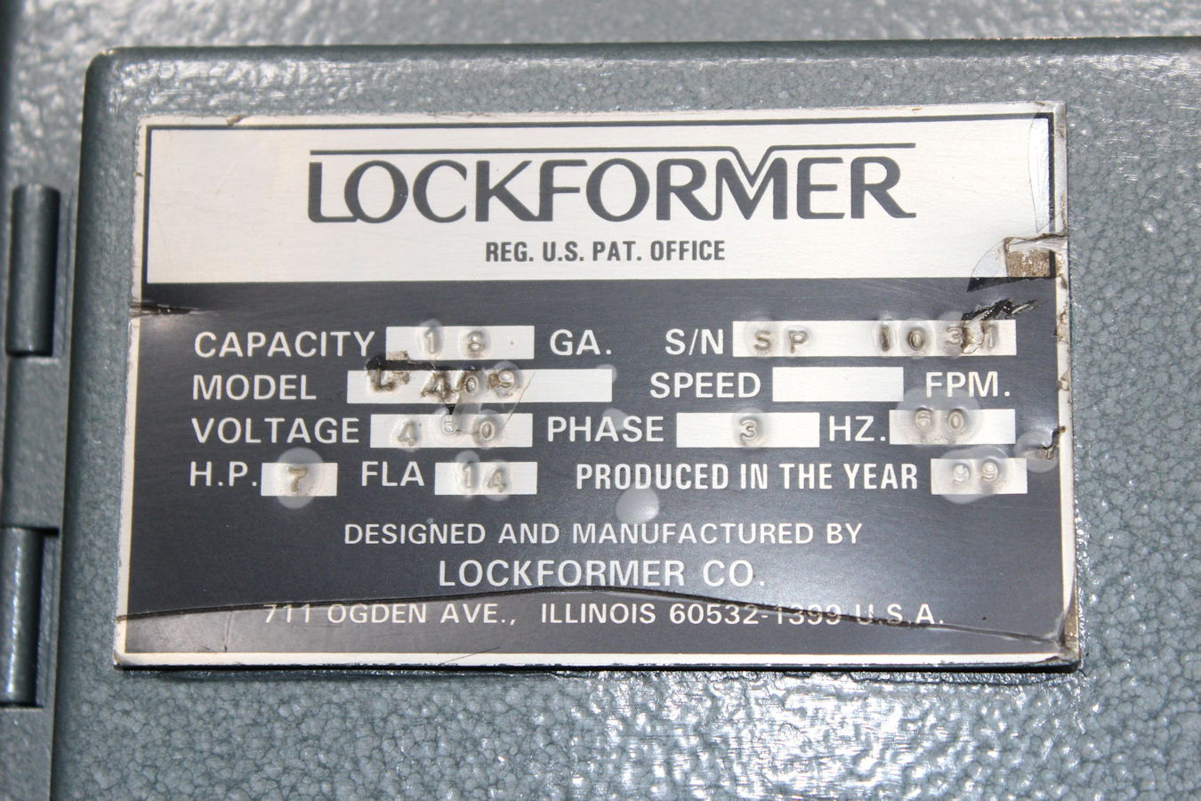 Model HD, S# L-16594-1183, Date Mfg. Nov. 1983, 16ga Heavy duty capacity, 1.5hp 220/440v 3ph 60cyc,