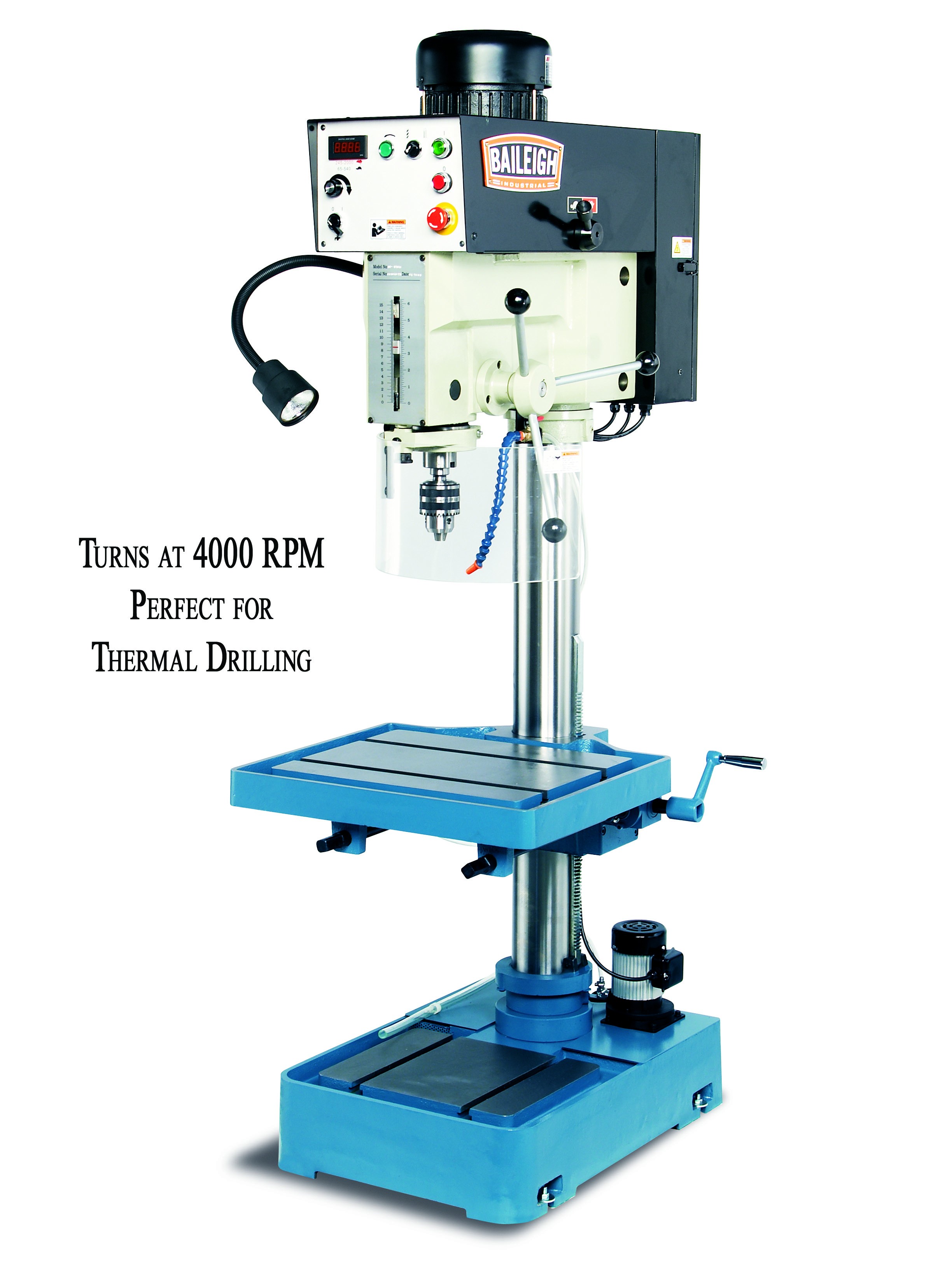 36.41", Spindle nose to base 48.22", Hi/Low Variable spindle speeds from 100 to 4,000 rpm, Column Dia.