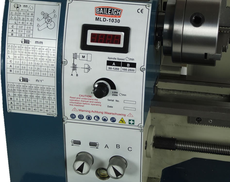 Model MLD-1030, 9.5" Swing, Swing over cross slide 5.7", 29.5" Between centers, Width of bed 5.3",