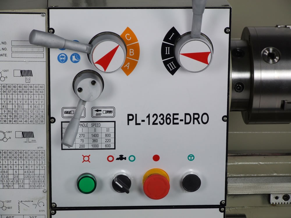 Model PL-1236E-DRO, 12" Swing, 17" Swing in 6"L gap, 7.625" Swing over cross slide, 36"
