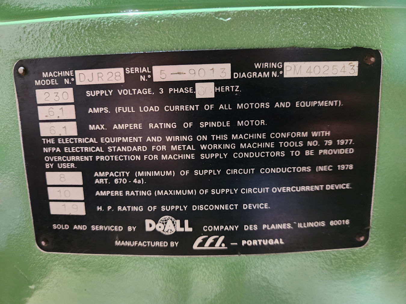 Model DJR-28, S# 5-9013, 30" x 21" Table, 24" Arm, 6" Column Dia.,