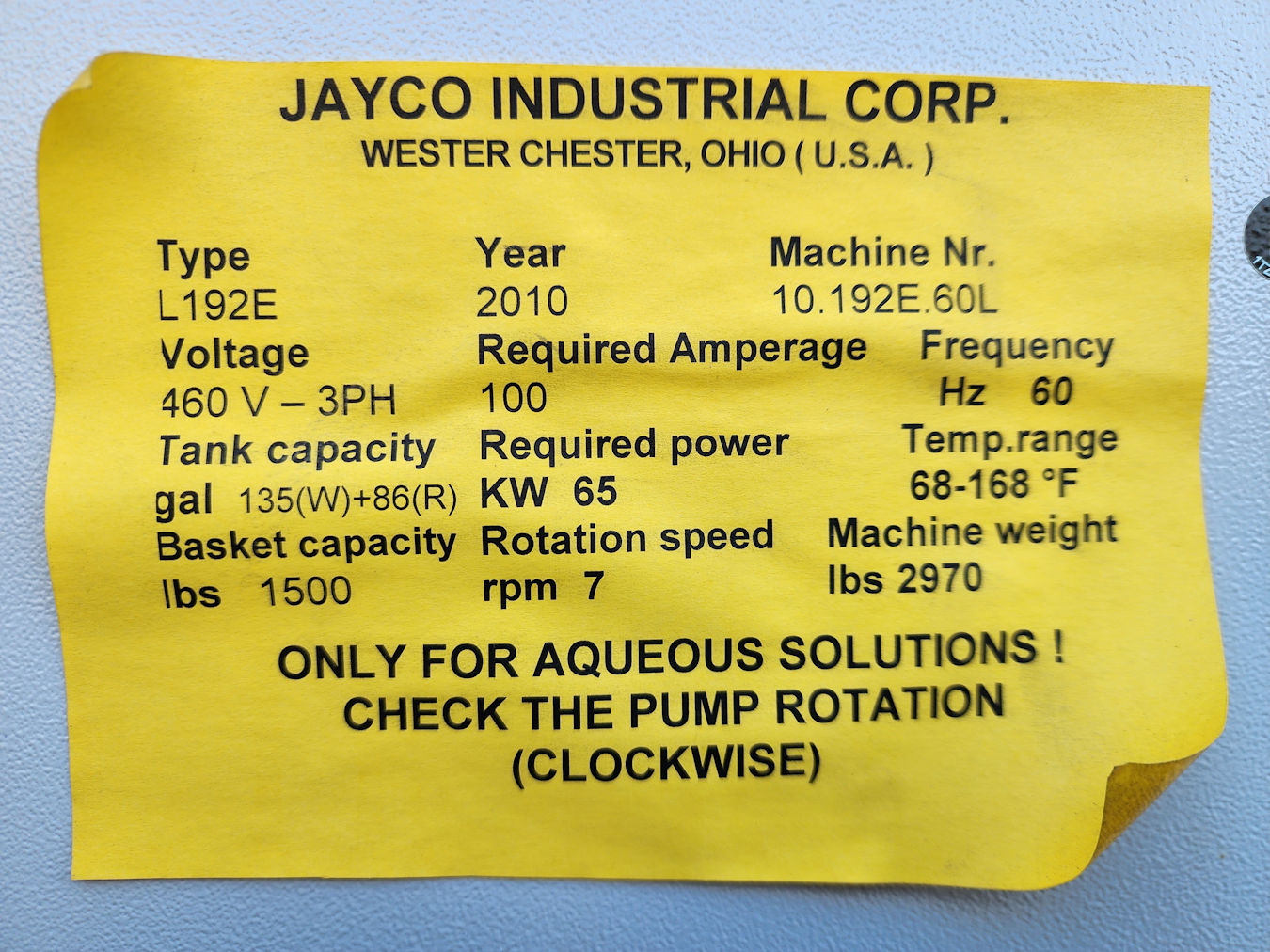 Model L192E, S# 10.192E.60L, Date Mfg. 2010, Tank capacity gal 135(W)+86(R),