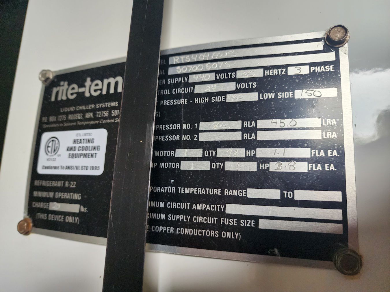 temp 80°F, Heat transfer fluid: water, 2hp Compressor, 0.25hp Condenser fan, 1hp Pump, 460v 3ph, More info